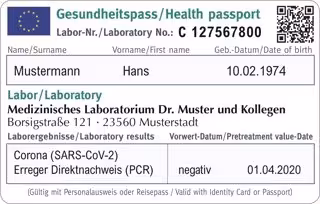 Los resultados del laboratorio se pueden transmitir tanto electrónicamente como en papel. En este caso, se crea junto con el informe médico del laboratorio un pasaporte sanitario y una tarjeta de plástico integrada en formato de tarjeta de crédito. El documento y la tarjeta de plástico tienen elementos de seguridad que impiden su copia.