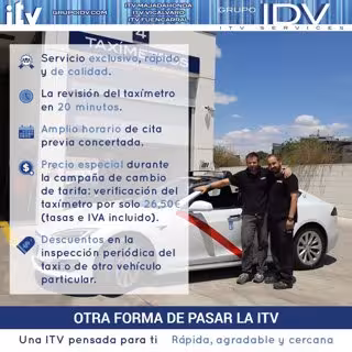 No es lo mismo revisión del taxímetro que ITV periódica del taxi. En GRUPO IDV-ITV Services pueden realizar ambos servicios, al tener la Acreditación de Organismo Autorizado de Verificación Metrológica. Además, en sus centros ofrecen un servicio profesional y eficaz: revisan los taxímetros en menos de 20 minutos y a un precio imbatible. La Inspección Metrológica del Taxímetro debe realizarse anualmente desde la instalación del aparato; y siempre que exista un cambio en las tarifas o una reparación