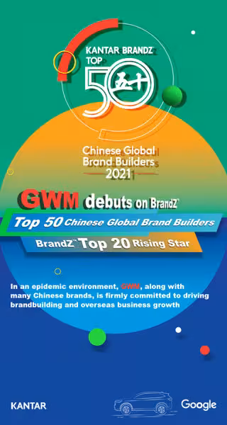BrandZ es una gran plataforma de creación de marca internacional y autorizada y la única lista de valor de marca que tiene en cuenta las opiniones de los consumidores. Desde 2017, Google se había unido a Kantar para recopilar datos en la plataforma de investigación de Google y evaluar el crecimiento de las marcas globales chinas con el modelo de valor de marca BrandZ, reconocido mundialmente, desarrollado por Kantar y basado en el volumen de búsqueda en Google. Kantar junto con Google lanzó la "Marca mundial china 2021 BrandZ Top 50". La investigación abarcó a más de 860.000 consumidores de 11 mercados. La lista de los 50 principales se basó en puntuaciones de importancia, diferenciación y destaque, y fue seleccionada entre 1.662 candidatos en 15 categorías. Según el FMI, la economía mundial ha caído un 3,5% debido a la pandemia. Sin embargo, muchas marcas chinas, incluida GWM, han mostrado la resolución de promover el establecimiento de la marca e impulsar el crecimiento comercial en el extranjero frente al incidente del "cisne negro".