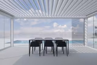 Aura, sistema de cerramiento acristalado deslizante y giratorio sin marco del cristal, proporciona un excelente aislamiento térmico y acústico 365 días al año. También permite la posibilidad de plegar los paneles de cristal a uno o ambos lados, para dejar todo completamente abierto, o cerrarlos, sin perder las vistas panorámicas gracias a la ausencia de perfiles verticales.