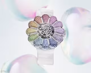Meticulosamente elaborada a partir de un bloque de cristal de zafiro, la modesta caja de 42 mm en forma de flor sonriente presenta 12 pétalos. Fiel a la paleta altamente cromática de Murakami, los 12 pétalos presentan incrustaciones de titanio pulido que están engastadas con 444 piedras preciosas de colores en total, incluidos rubíes de talla brillante, zafiros rosas, amatistas, zafiros azules, topacios azules, tsavoritas y zafiros amarillos o naranjas. Estas piedras están agrupadas de modo que cada pétalo sea de un color vibrante diferente, al igual que la flor sonriente original de Murakami.