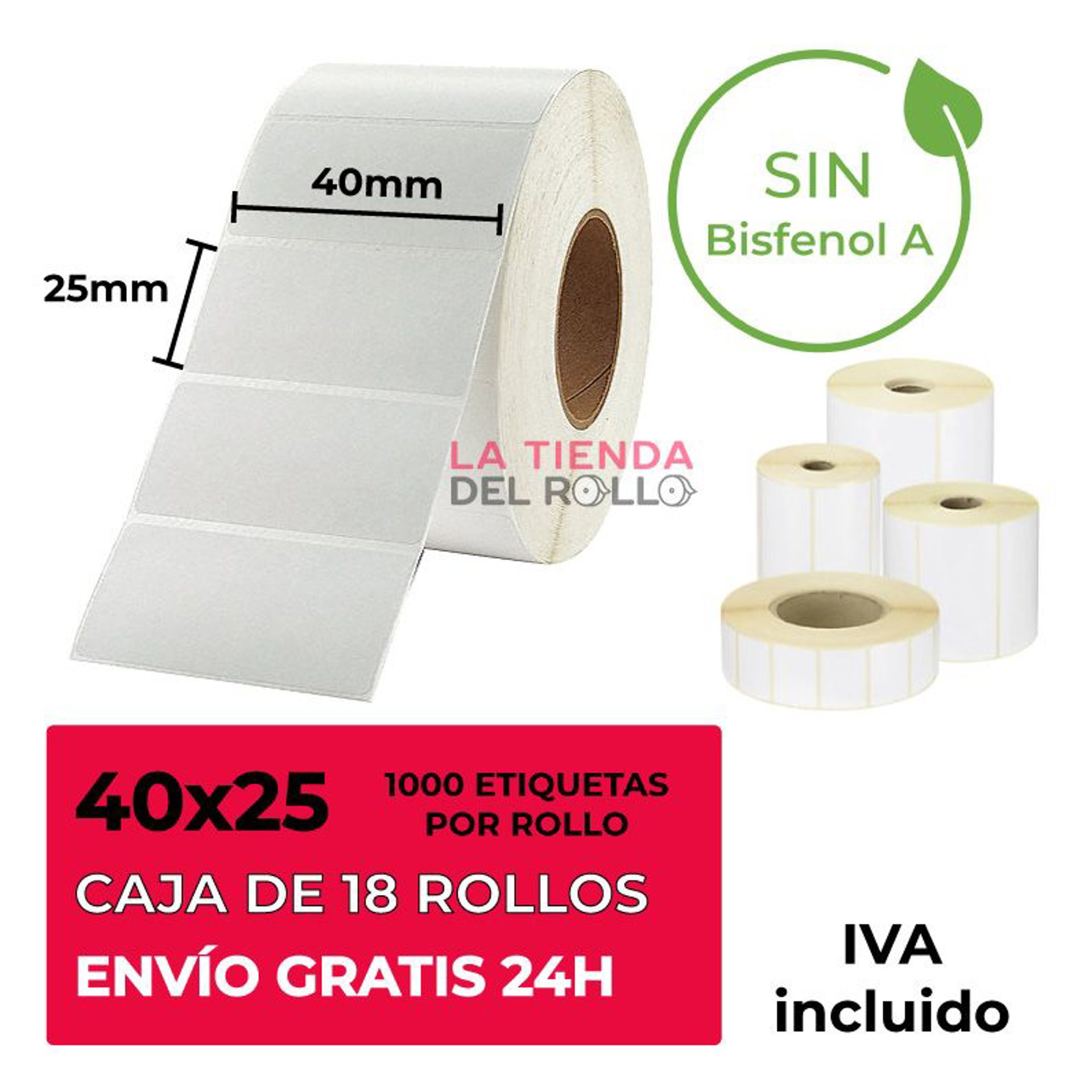 Rollos Etiquetas Térmicas Adhesivas 40x25 18ud sin bisfenol A. - La Tienda del Rollo