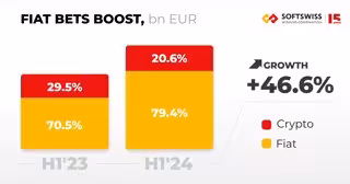 En términos absolutos, la suma total de apuestas, que engloba tanto fiat como cripto, creció un 46,6% en la primera parte de 2024, en comparación con el mismo periodo del año anterior. El análisis en curso desde principios de 2022 indica que las apuestas fiat están experimentando un mayor crecimiento en comparación con las criptoapuestas. Comparando el primer semestre de 2024 con el mismo periodo de 2023, la suma de apuestas fiat aumentó un 65,2%.