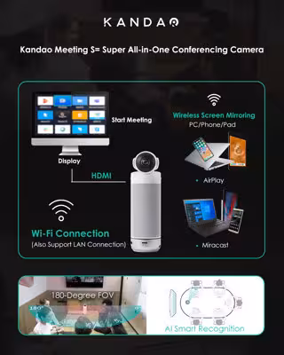 Kandao Meeting S está equipado con una lente de 195 grados para lograr una imagen de 180 grados cubierta por todos los asistentes sin distorsión. Permite que todos los asistentes se unan a la conversación en tiempo real con su sistema de audio dúplex completo que consta de ocho micrófonos de nivel profesional y una variedad de altavoces Hi-Fi. Tener un sistema Android incorporado fue el punto más que lo hizo distinguir. No es necesario volver a instalar el software de conferencias cada vez que cambia de ordenador, el software se puede instalar y ejecutar directamente en el Meeting S. Con un algoritmo de reconocimiento de IA de última generación incorporado, el portavoz puede ser localizado, rastreado y localizado en tiempo real con precisión  y resaltado.