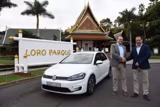 Loro Parque Fundación apuesta por la movilidad sostenible con la incorporación de un coche 100% eléctrico con 300 kilómetros de autonomía, gracias a la colaboración de Domingo Alonso Group. La entrega del automóvil se ha realizado este miércoles, 27 de noviembre, en las instalaciones de Loro Parque. El evento ha contado con la participación del doctor Javier Almunia, director científico de la Fundación y el gerente de Volkswagen en Domingo Alonso Tenerife, Juan Carlos Estrada.