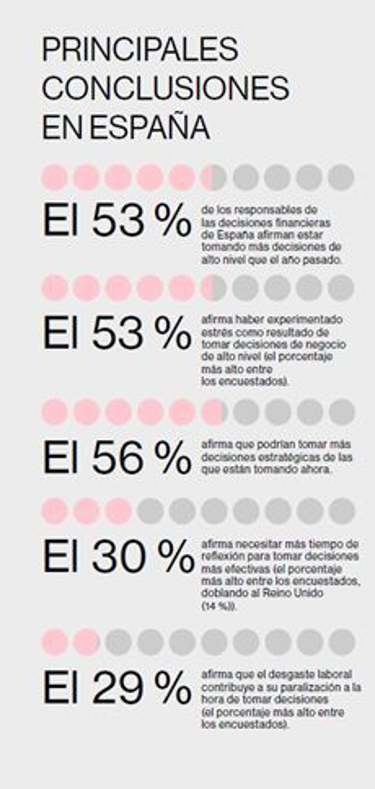 Según el estudio, un 53% de los directivos financieros españoles reconoce haber sufrido estrés al tomar decisiones de alto nivel, situando a España como el país más afectado entre los encuestados. Además, un 29% señala el burnout como un factor directo que contribuye a los bloqueos decisionales. A ello se suma que un 30% afirma necesitar "espacio mental" para tomar decisiones de calidad, el doble que en Reino Unido (14%).