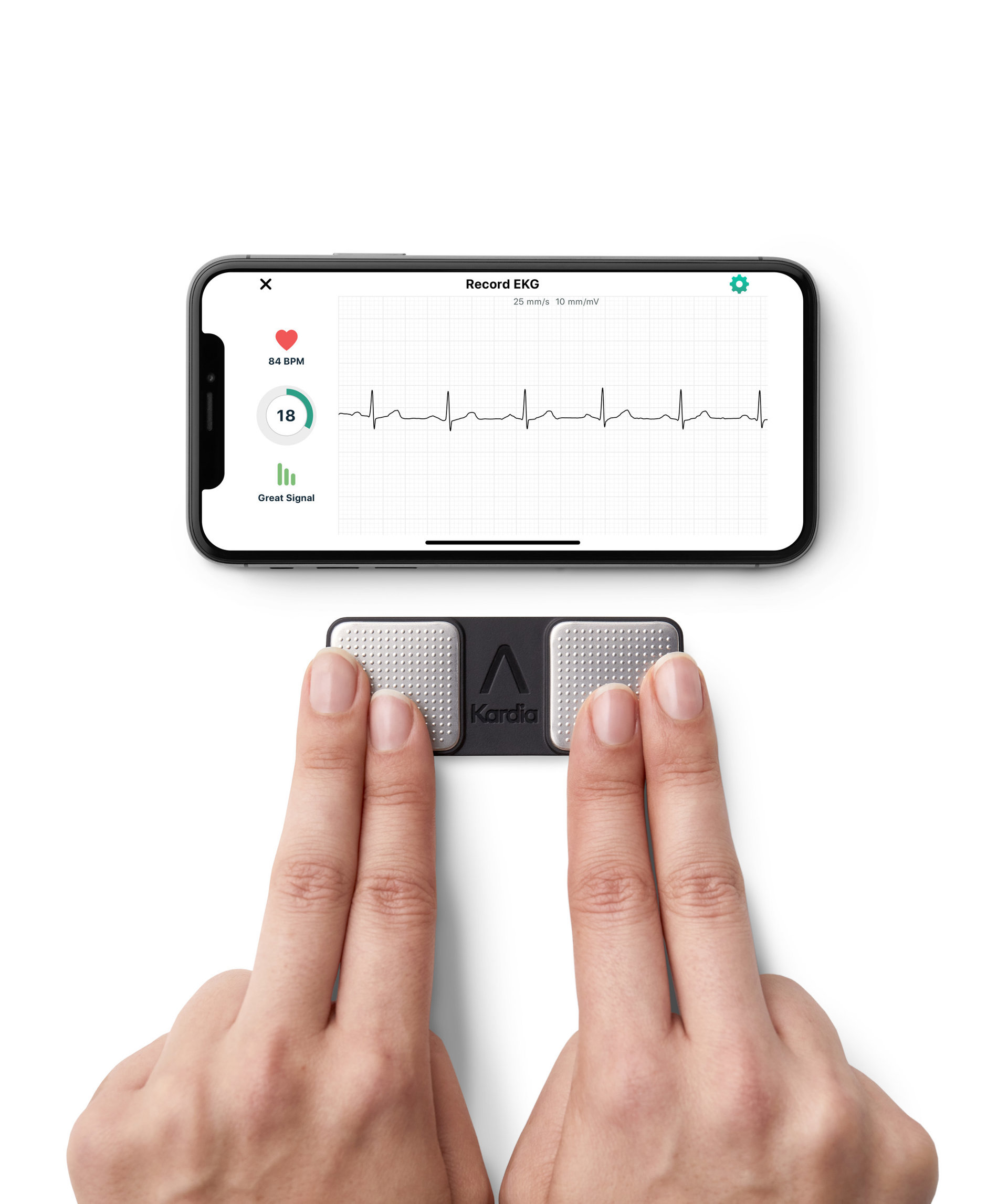 KardiaMobile es el ECG personal más validado clínicamente del mundo. A diferencia de los ECG tradicionales, KardiaMobile ofrece una solución integral, sin parches e inalámbrica que puede utilizarse en cualquier momento y en cualquier lugar. El usuario inicia un registro de ECG de 30 segundos en su smartphone a través de la aplicación Kardia -colocando dos dedos de cada mano en cada uno de los dos electrodos superiores-, lo que permite al paciente capturar de forma remota un registro de grado médico de su actividad cardíaca. KardiaMobile proporciona una detección instantánea de la FA, la bradicardia y la taquicardia, que son los principales indicadores de las enfermedades cardiovasculares. KardiaMobile también puede detectar el ritmo cardíaco normal, ofreciendo a los usuarios tranquilidad.