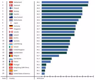 Los resultados muestran que Suiza es el país con la puntuación más alta, con un 88,1, seguido por Dinamarca (88,0) en segundo lugar y Finlandia, Noruega y Suecia empatados en el tercer puesto (86,9). Cabe destacar que superpotencias mundiales como Estados Unidos no figuran entre los diez primeros, lo que simboliza un cambio significativo en lo que estos gigantes económicos pueden ofrecer de forma tangible a la élite mundial. Comparativamente, Asia surgió como centro de prosperidad económica debido a sus ventajas empresariales, en particular Japón, que ocupó el sexto lugar, y Singapur, que se situó en el séptimo.