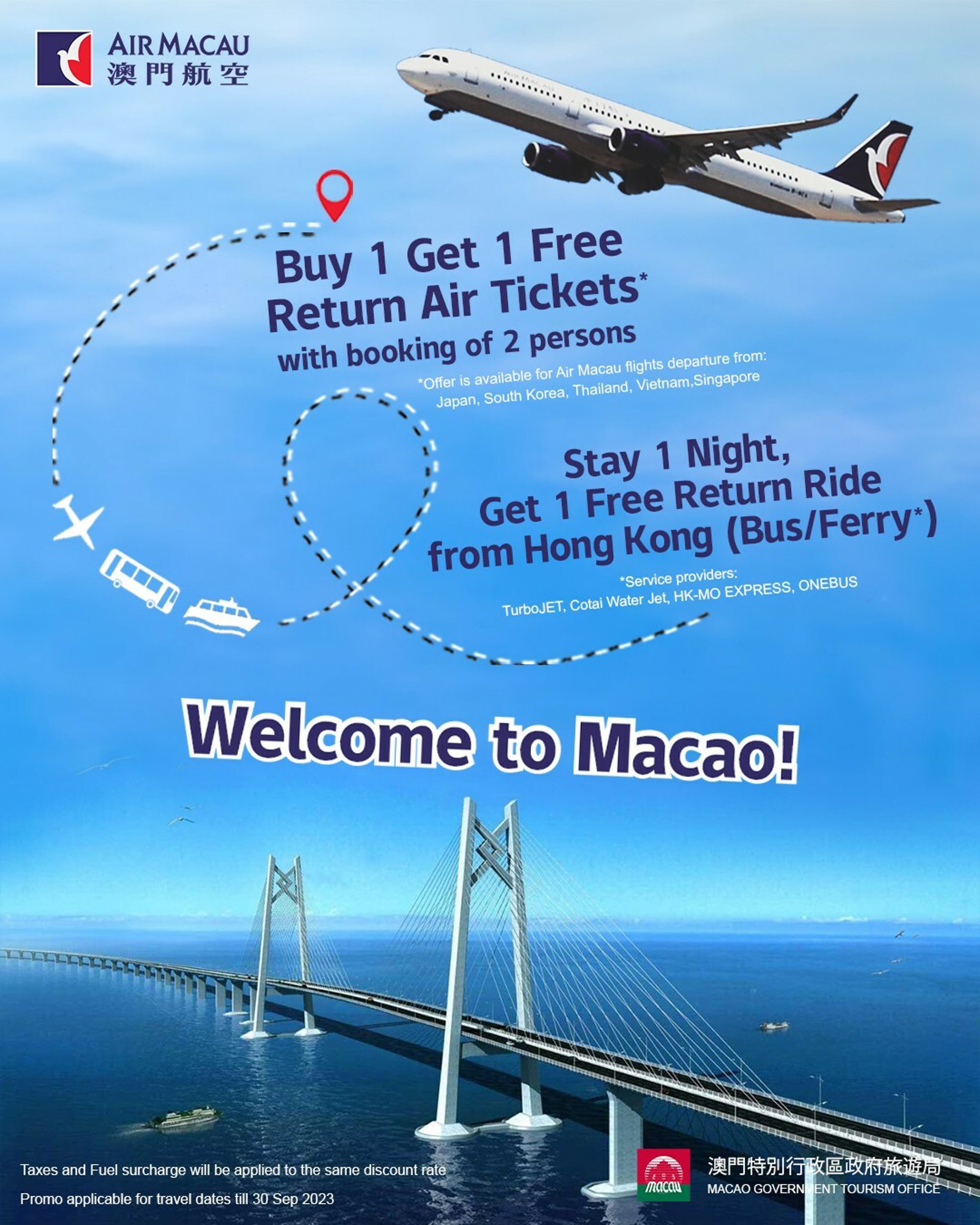 Book your air tickets with Air Macau to enjoy Buy 1 Get 1 Free - MACAO GOVERNMENT TOURISM OFFICE/PR NEWSWIRE
