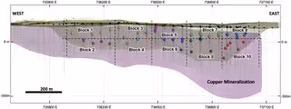 - Las pruebas de flotación sobre siete de los bloques (bloques 1-5, 8 y 10) alcanzaron leyes destacables de concentrado oscilando entre 26,8% y 32,5% Cu (promedio 29,1% Cu) y recuperaciones globales de 73,5% a 88,3% Cu (promedio 81,4% Cu).