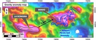 La campaña geofísica de 18,2 km de líneas de IP completada recientemente ha identificado anomalías de cargabilidad y resistividad coincidentes con la anomalía gravimétrica de Bravo. Estos resultados indican una potencial extensión o repeticiones con la alineación geológica que alberga la mineralización de La Romana, ubicada a 1 km al oeste de Bravo. Los resultados de la campaña IP se han integrado con los modelos de gravimetría detallada de la Compañía, la geoquímica de suelos y los datos del estudio electromagnético aeroportado para priorizar los objetivos de perforación.