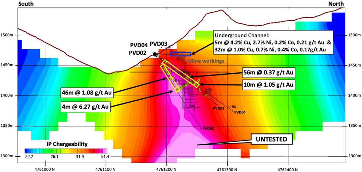 El Sr. Moody añadió: "Una fuerte anomalía de cargabilidad IP coincide con la mineralización de Providencia y permanece abierta muy por debajo de los antiguos trabajos de la mina subterránea, lo que indica que la mineralización se extiende y se expande potencialmente en profundidad. Esta anomalía es parte de los objetivos que se comprobarán en el programa de sondeos de la Fase 2". (véase la Figura 1)