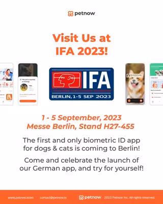 BERLÍN, 25 de agosto de 2023 /PRNewswire/ -- Petnow Inc. se complace en anunciar la expansión de su aplicación de identificación biométrica para perros y gatos a otros países europeos, incluidos Alemania, Austria, Suiza, Liechtenstein, Países Bajos, Hungría, Polonia y República Checa, a partir del 29 de agosto. La aplicación hará su debut en el próximo evento IFA Berlín 2023.
