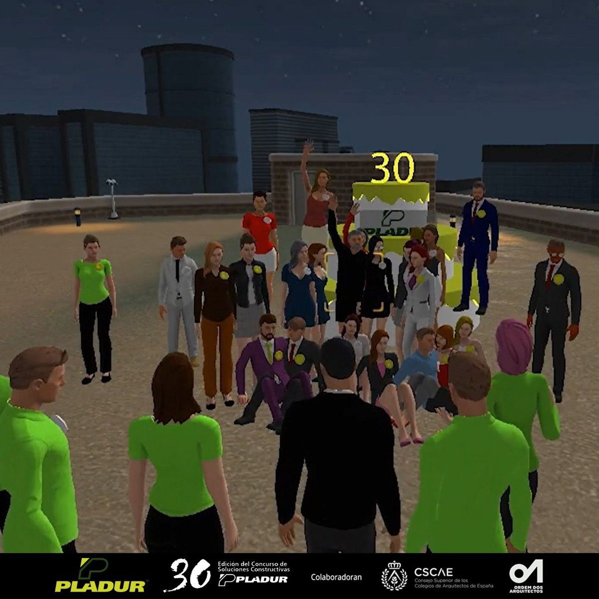 La recepción de los invitados tuvo lugar en un escenario virtual, en el que los avatares podían interactuar y acceder a diferentes espacios diseñados para esta ocasión especial: la biblioteca donde se podían recorrer los 30 años de historia del Concurso, la zona de networking con una interesante exposición comercial de la gama Pladur, la galería de proyectos ganadores, el auditorio y la sala de conciertos.