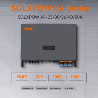 Para aplicaciones comerciales, PowMr presenta los modelos X3 y X4, diseñados para satisfacer las elevadas exigencias energéticas de las empresas. La serie X3, disponible de 10 kW a 20 kW, ofrece una elevada eficiencia máxima del 98,4% y una potente capacidad de carga/descarga de 40 A, adecuada para operaciones a mayor escala. La serie X4, de 25 kW a 50 kW, establece un nuevo estándar con una impresionante eficiencia máxima del 98,8% y una importante capacidad de carga/descarga de 100 A. Estos modelos están equipados con una función trifásica y hasta 4 MPPT, lo que permite conectar más paneles solares y satisfacer diversas necesidades energéticas comerciales.