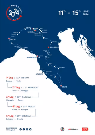 Después de la mitad del camino en Roma, el cuarto día las tripulaciones conducirán hasta Orvieto antes de parar para almorzar en Solomeo, un característico pueblo medieval enclavado en las colinas de Umbría, desde donde partirán nuevamente hacia Siena y Prato. Antes de llegar al final de la etapa en Bolonia, pilotos y navegantes cruzarán los pasos de Futa y Raticosa. Desde Bolonia, la última etapa incluirá Ferrara y Mantua, y nuevamente el Lago de Garda con los Valtenesi y Sal antes del clásico desfile en Viale Venezia en Brescia.