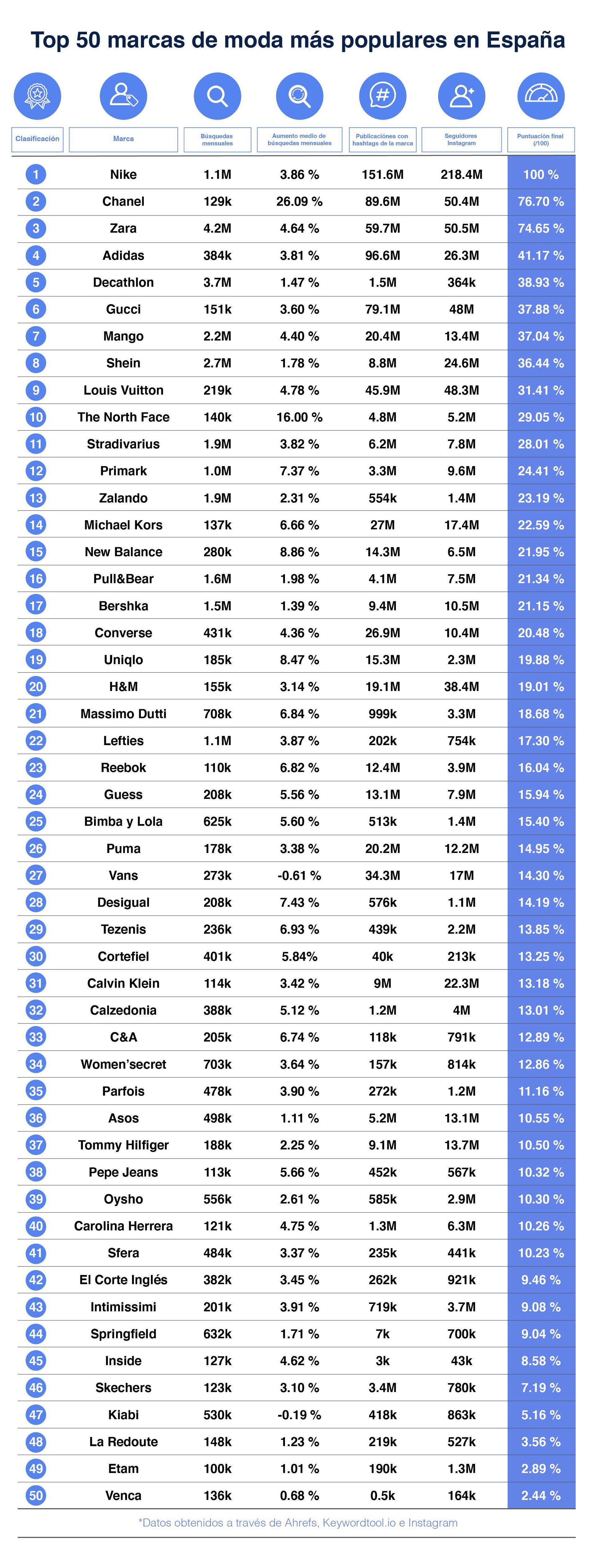 *Este ranking de la moda española se ha calculado por medio de un análisis de las búsquedas online mensuales en España y de la presencia mundial de las marcas en Instagram. Fuentes de datos utilizadas: Ahrefs.com, keywordtool.io e Instagram.com