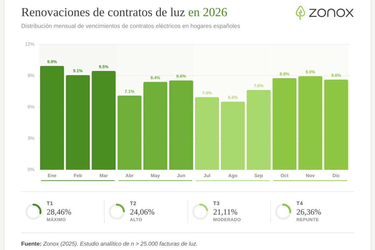Madrid, 26 de marzo de 2026.- La factura de la luz de marzo apenas ha reflejado el impacto de la guerra en Irán. La de abril y mayo será otra historia. No porque el mercado vaya a dispararse de nuevo, sino porque muchos hogares españoles firmaron o aceptaron renovaciones de contrato en las semanas de mayor tensión del mercado y esos precios, más altos, empezarán a aparecer ahora en los recibos, sumando hasta 200 euros de sobrecoste a lo largo de los próximos 12 meses. Así lo revela el análisis de Zonox, plataforma independiente en defensa del consumidor energético, a partir de datos reales de más de 25.000 facturas de luz y gas.