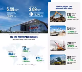 SANY ha mejorado su competitividad internacional y ha logrado un salto histórico en el crecimiento del rendimiento: los ingresos por ventas internacionales en el primer semestre de 2023 ascendieron a 22.466 millones de yuanes (3.090 millones de dólares estadounidenses), un fuerte aumento interanual del 35,87% y representa el 56,88% de los ingresos operativos totales.