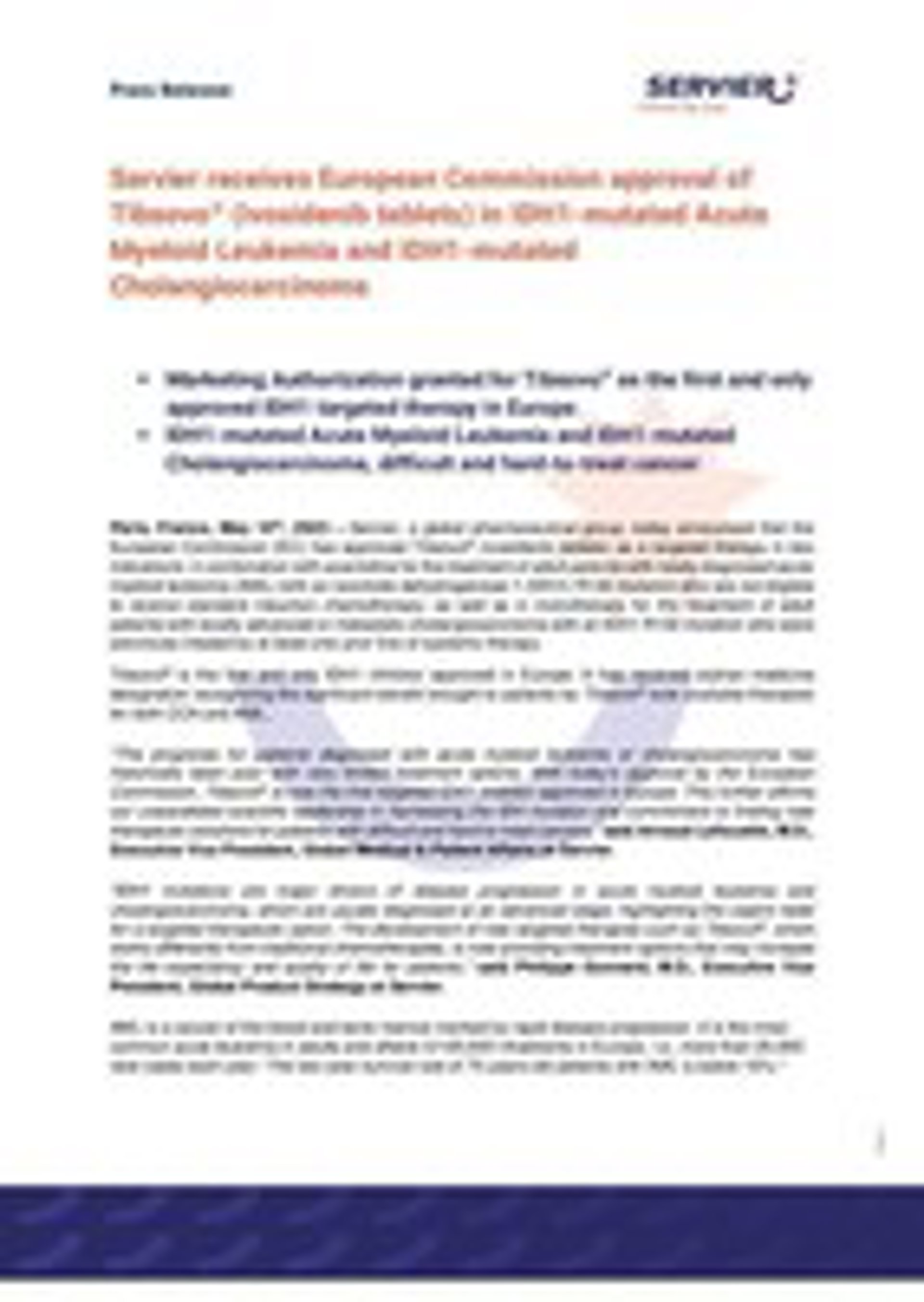 PARIS, May 10, 2023/PRNewswire/ -- Servier, a global pharmaceutical group, today announced that the European Commission (EC) has approved Tibsovo (ivosidenib tablets) as a targeted therapy in two indications: in combination with azacitidine for the treatment of adult patients with newly diagnosed acute myeloid leukemia (AML) with an isocitrate dehydrogenase-1 (IDH1) R132 mutation who are not eligible to receive standard induction chemotherapy; as well as in monotherapy for the treatment of adult patients with locally advanced or metastatic cholangiocarcinoma with an IDH1 R132 mutation who were previously treated by at least one prior line of systemic therapy.