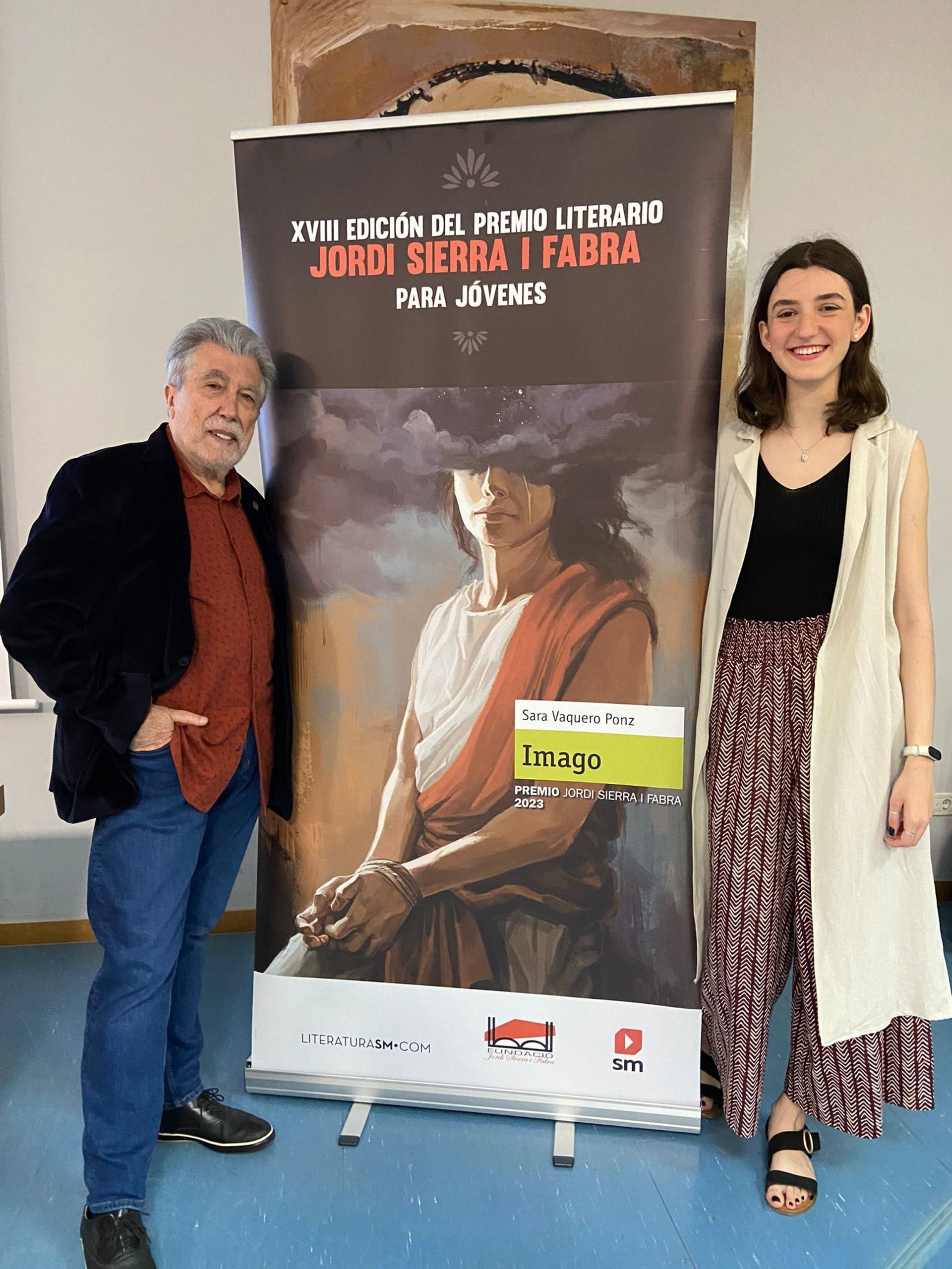 Zaragoza, 8 de junio de 2023.- SM ha presentado hoy en Zaragoza la novela ganadora del XVIII Premio Jordi Sierra i Fabra para jóvenes escritores. Sara Vaquero Ponz, joven zaragozana de 19 años, ha recogido el galardón de la mano el reconocido escritor Jordi Sierra i Fabra, y Berta Márquez, gerente editorial de Literatura Infantil y Juvenil de SM, en su antiguo instituto, Salesianos Zaragoza.Imago que llega hoy a librerías ha sido definida por el jurado como una novela "valiente y poco convencional con protagonistas potentes, una fantástica documentación y un final soberbio".