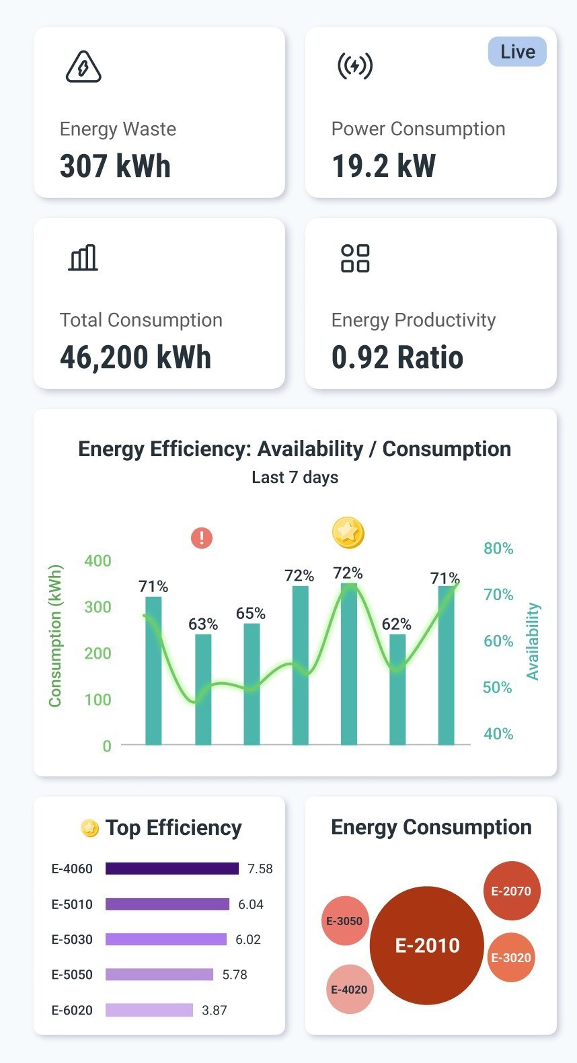 - Establecer KPI's para la fabricación sostenible: Identificar su día, semana o mes con mayor eficiencia energética y replicar los procesos para realizar mejoras continuas