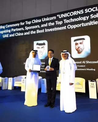 S.E. el Dr. Thani bin Ahmed Al Zeyoudi, Ministro de Estado de Comercio Exterior de los EAU y Vicepresidente del Consejo de Desarrollo Industrial, y S.E. Dawood Al Shezawi, Presidente de la Reunión Anual de Inversiones, entregaron el premio a Ge Jun.