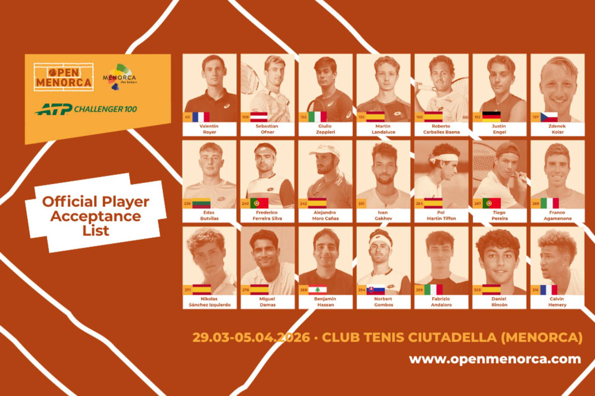 Menorca, 11 de marzo de 2026.- El Open Menorca ATP Challenger 100 ya tiene confirmados los primeros 21 jugadores del cuadro principal de su edición 2026, encabezados por el francés Valentin Royer, actual número 60 del ranking ATP y el jugador mejor clasificado entre los participantes confirmados hasta el momento.