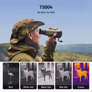 Con una lente de 13 mm con capacidad de zoom digital de 8x y cinco paletas de colores que incluyen Bird, White Hot, Black Hot, Red Hot y Fusion, el TS004 identifica objetivos de manera rápida y precisa en condiciones de poca luz y oscuridad total. Está alimentado por una batería de 5000 mAh de alta eficiencia, que ofrece más de 11 horas de uso al aire libre sin interrupciones. La carcasa de plástico resistente al agua IP67 garantiza la protección contra fuertes lluvias, nieve, barro y otras condiciones climáticas extremas.