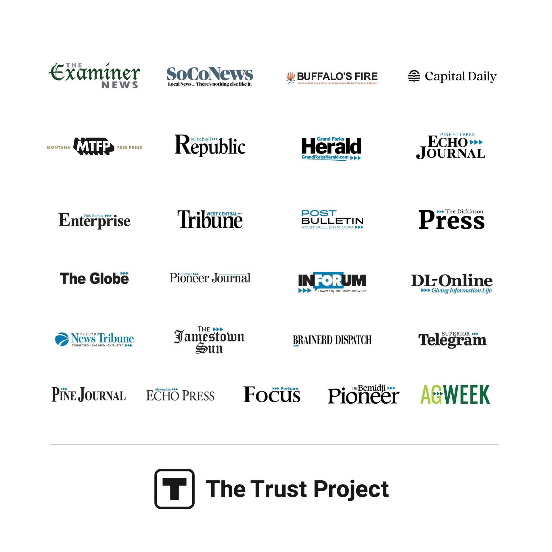 Con este grupo, los Indicadores de Confianza aparecerán por primera vez en sitios de noticias enfocadas en indígenas americanos, Buffalo's Fire, y en dos boletines de información periodística. Forum Communications, una empresa familiar de medios de comunicación y de tecnología que opera desde 1878, ofrece al público por primera vez los Indicadores de Confianza en sus 20 sitios de noticias esta semana. Capital Daily un diario independiente de Victoria, Columbia Británica, brinda a sus lectores cobertura de investigación y explicación analítica y noticiosa a través de su sitio web y su boletín informativo. The Examiner News publica cuatro periódicos comunitarios, y un boletín de noticias de contenido digital de primera calidad, todos ellos al servicio en el valle sur del Rio Hudson, en Nueva York. Montana Free Pressproduce un periodismo en profundidad de servicio público sobre el gobierno estatal y la política. SoCoNews.org, produce un periodismo en profundidad de servicio público sobre el gobierno estatal y la política.