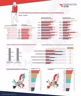 Con motivo del Día Internacional de la Mujer, la Fundación CYD (Conocimiento y Desarrollo) presenta datos sobre los matriculados y egresados universitarios para analizar la participación relativa de las mujeres en comparativa europea; una reflexión sobre la presencia femenina en la educación superior y su implicación en disciplinas STEM así como en los diversos campos científicos y tecnológicos
