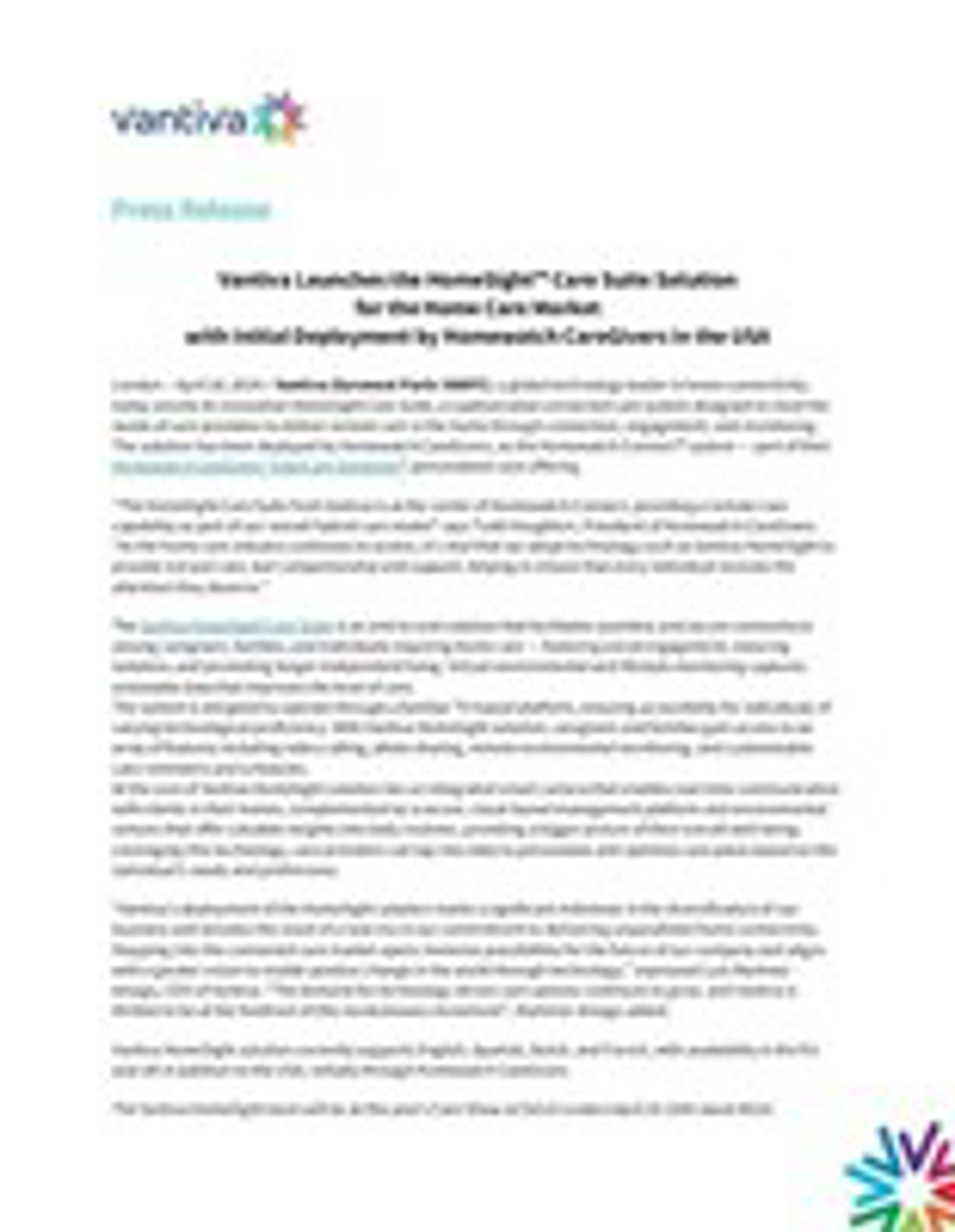 LONDON and PARIS, April 18, 2024 /PRNewswire/ -- Vantiva (Euronext Paris: VANTI), a global technology leader in home connectivity, today unveils its innovative HomeSight Care Suite, a sophisticated connected care system designed to meet the needs of care providers to deliver remote care in the home through connection, engagement, and monitoring. The solution has been deployed by Homewatch CareGivers, as the Homewatch Connect system part of their Homewatch CareGivers Total Care Solutions personalized care offering.
