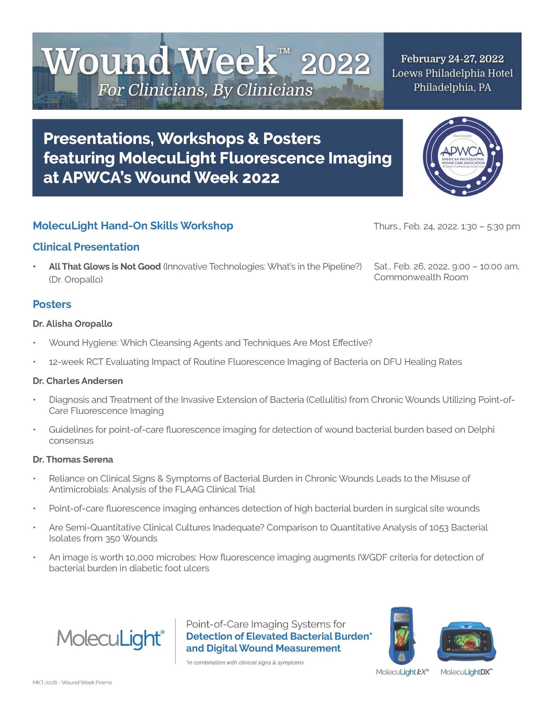 Además de los pósters clínicos y presentaciones en la Wound Week, los dispositivos de imagen MolecuLight i:X y DX se mostrarán en el Taller práctico del jueves, 24 de febrero de 1:30 pm 5:30 pm en Regency B Ballroom. También estarán disponibles para demostraciones en el stand #36 de MolecuLight en la sala de exposiciones de Loews, Filadelfia, PA.
