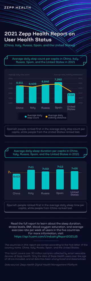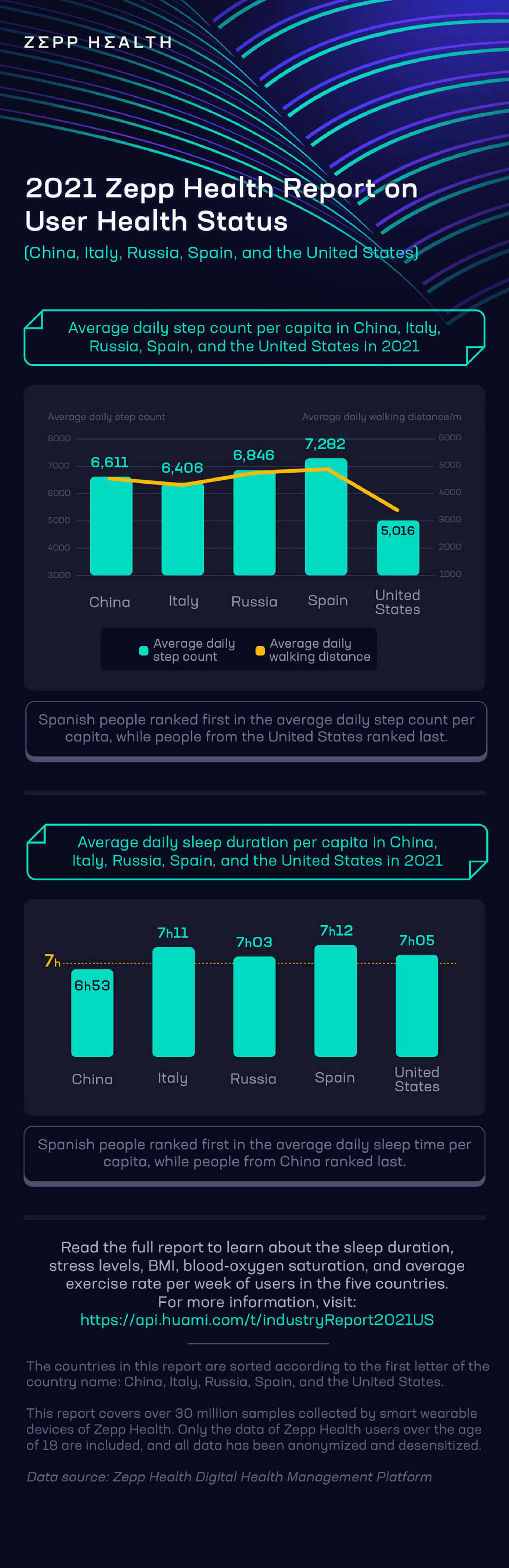 CUPERTINO, Calif., 24 de enero de 2022 /PRNewswire/ -- Zepp Health (NYSE: ZEPP), una marca líder mundial de dispositivos inteligentes para llevar, ha publicado recientemente sus Informes 2021 sobre el estado de salud de los usuarios en cinco países del mundo. Los informes contienen conclusiones clave derivadas de los datos de más de 30 millones de usuarios globales, capturados por los dispositivos portátiles inteligentes de la compañía en 2021. Los datos recogidos se han procesado utilizando técnicas de enmascaramiento de datos para garantizar la privacidad de la información personal.