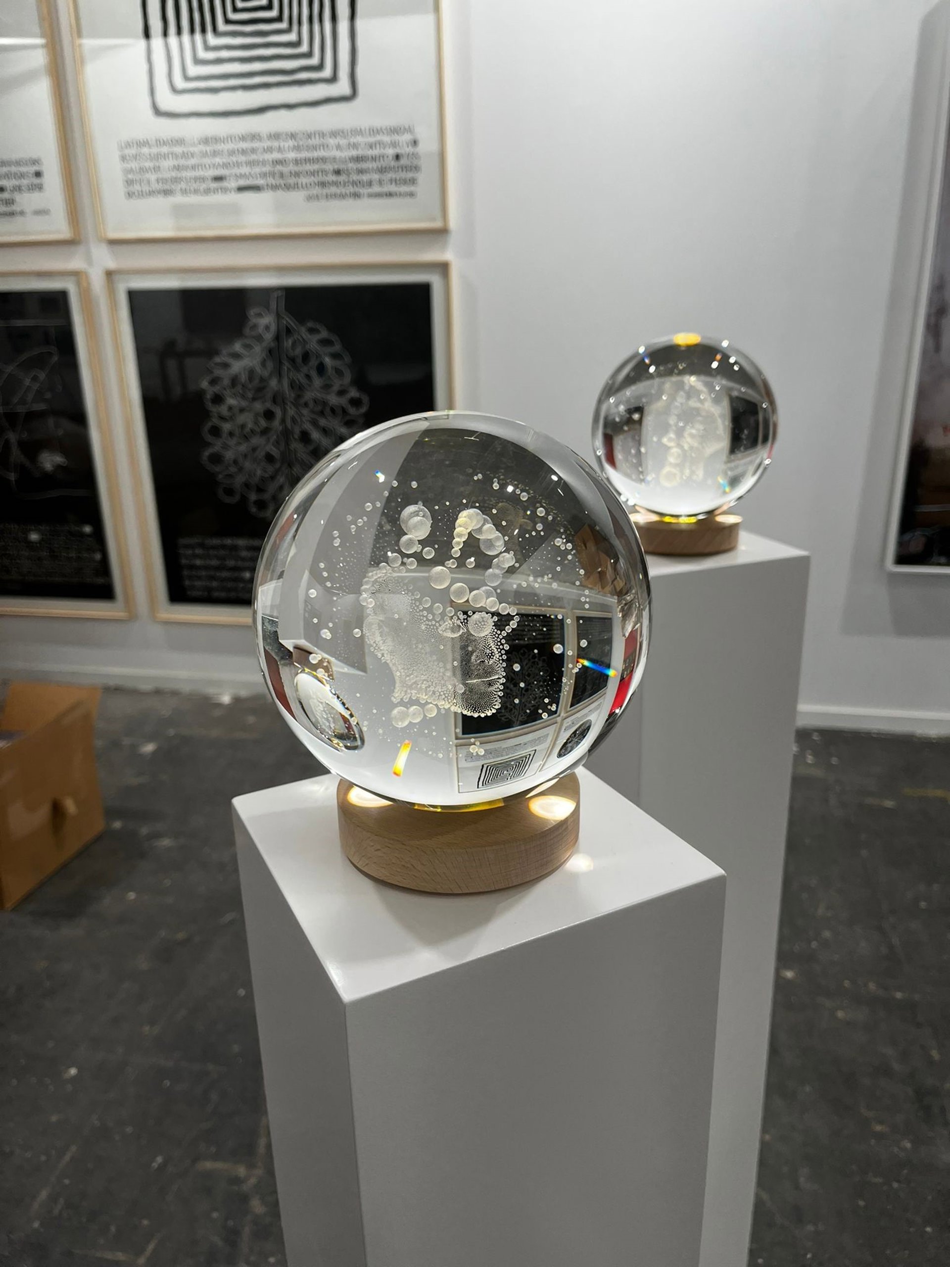 Entre los nombres propios de artistas que han apostado por la IA destaca el de Marina Núñez en la Galería RocioSantacruz y sus 'Esferas de cristal grabadas con láser', con un precio aproximado de 30.000 euros. Esta obra comprende varias bolas de cristal en las que cobran vida rostros semihumanos.
