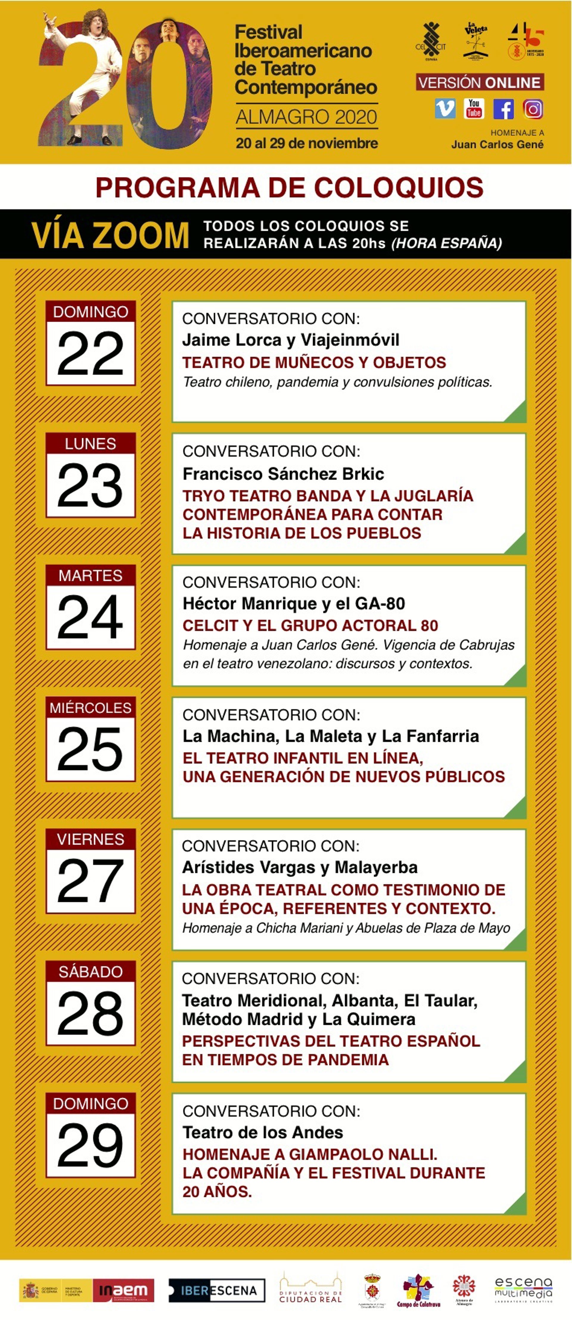 El Festival de Teatro de Almagro está programando una serie de eventos especiales para celebrar veinte ediciones ininterrumpidas y 45 años de creación del Centro Latinoamericano de Investigación y Creación Teatral, entre los que destacan el homenaje al maestro Juan Carlos Gené, dramaturgo y director argentino; el homenaje a Chicha Mariani y Las Abuelas de la Plaza de Mayo por su labor incansable en mantener viva la memoria; y siete coloquios temáticos que se efectuarán a partir del 22 de noviembre.