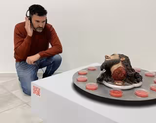 El artista Juan Baños presenta en su ciudad natal, Granada, la creación 'Retrato sin órganos - SalomÍA', que fusiona arte, ciencia y música con la Inteligencia Artificial como coautora. En la obra aparecen elementos destacados como una cabeza de San Juan Bautista con placas con cultivos bacterianos e incorpora la IA para desarrollar sinfonías musicales personalizadas.