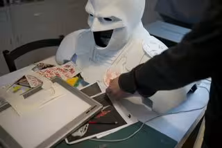 "Cristian Michel muestra tanto un busto como una capa color azul, donde se ve una caricatura de cada uno de los personajes principales que aparecen en el cómic original. Bern Baños enseña a un murciélago con una capa de plumas elaboradas con lona", ha destacado Rego.