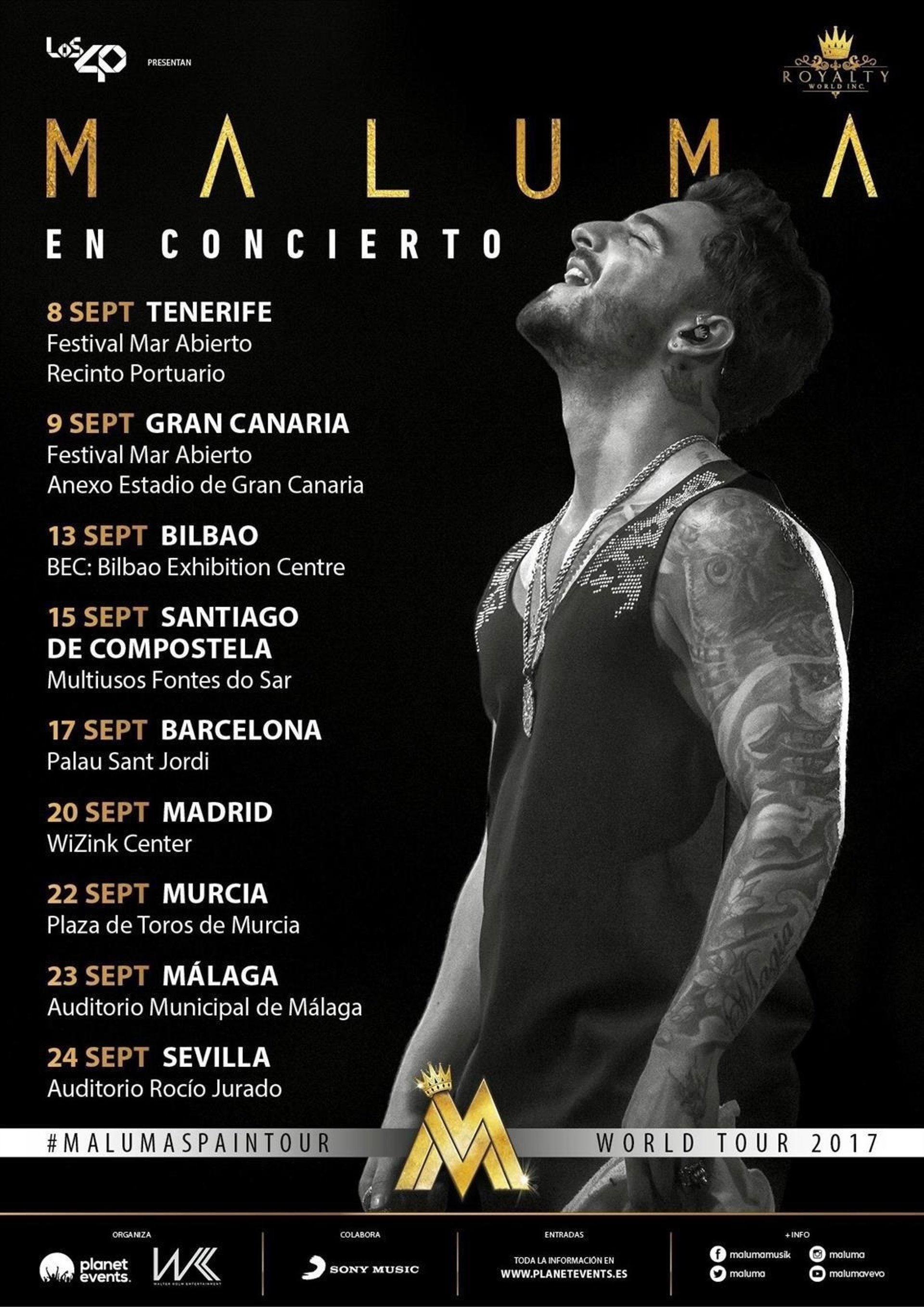 Uno de los referentes de la música urbana, Maluma, confirma concierto para el 15 de septiembre en el Multiusos Fontes do Sar de Santiago de Compostela (España), última fecha de una gira con la que visitará nueve ciudades españolas en septiembre.