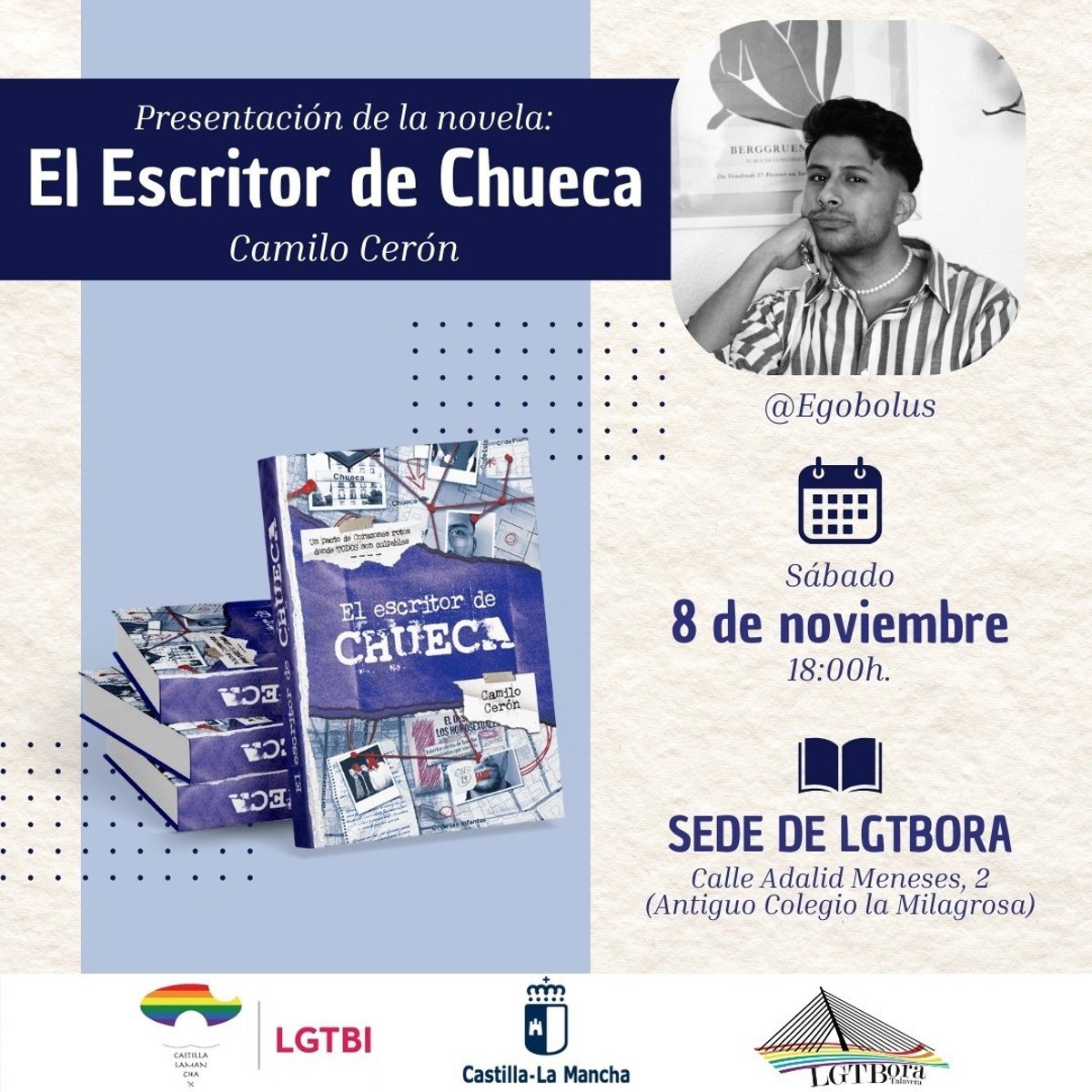 La sede de LGTBora en Talavera de la Reina va a acoger este sábado la presentación de 'El escritor de Chueca', la joven de Camilo Cerón, un escritor colombiano y talaverano que hace suyo el misterio y la contradicción en las calles del popular barrio de Chueca