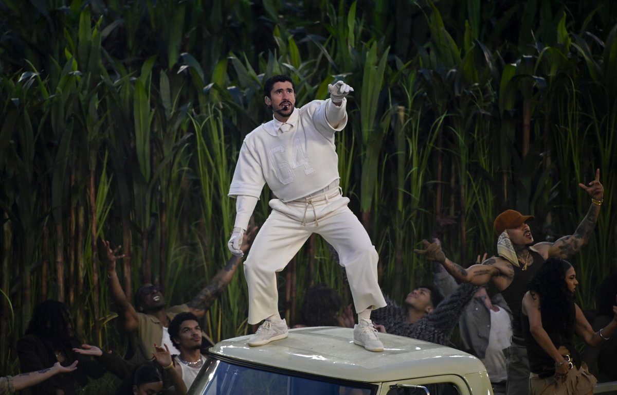 February 08, 2026 Bad Bunny performs during halftime of the NFL Super Bowl 60 between the Seattle Seahawks and the New England Patriots at Levi's Stadium in Santa Clara, California. Mandatory
