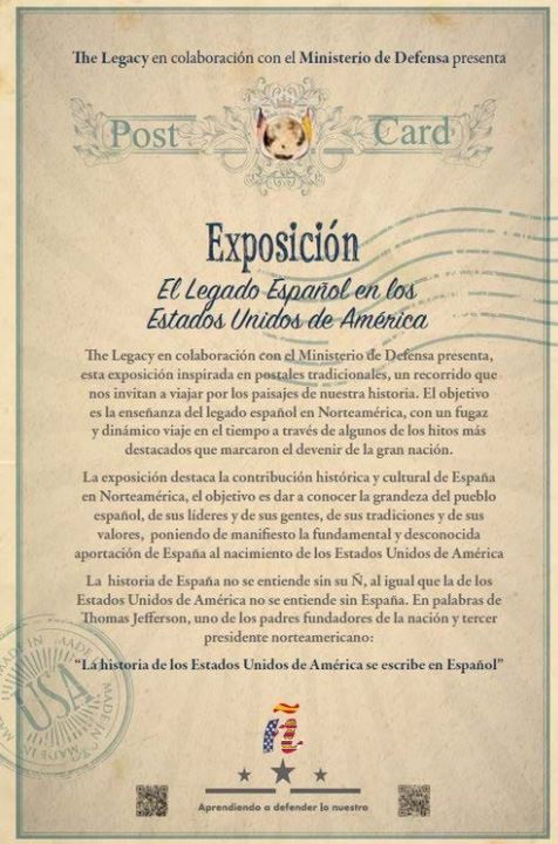 Esta exposición es el resultado de una colaboración entre The Legacy y el Ministerio de Defensa, y cuyo objetivo es la enseñanza del legado español en Norteamérica mediante un fugaz y dinámico viaje en el tiempo en el que se presentan los hitos más destacables que marcaron el devenir de esa gran nación.