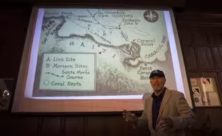Investigador Barry Clifford con un plano de la carabela Santa María de Colón