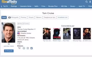 Cada perfil de las figuras del séptimo arte, al que se puede acceder a través de FilmAffinity de forma gratuita y sin necesidad de registrarse, incluye fotos y los principales datos personales, así como todas sus películas y series, premios, colaboradores, estadísticas, redes sociales, etc.