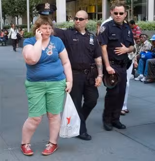 Aquí muestra la reacción de extraños cuando ella hace actividades cotidianas. Es imposible saber qué piensan estos adultos, pero Haley deja que sus miradas indiscretas o sus gestos críticos nos revelen la burla o el desprecio que sigue suscitando hoy en día una persona con sobrepeso.