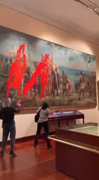 Dos activistas del colectivo climático Futuro Vegetal han atacado con pintura biodegradable roja el cuadro 'Primer homenaje a Cristóbal Colón', de José Garnelo, en el Museo Naval de Madrid. Los miembros ecologistas portaban el lema '12 de octubre, nada que celebrar. Justicia ecosocial'.