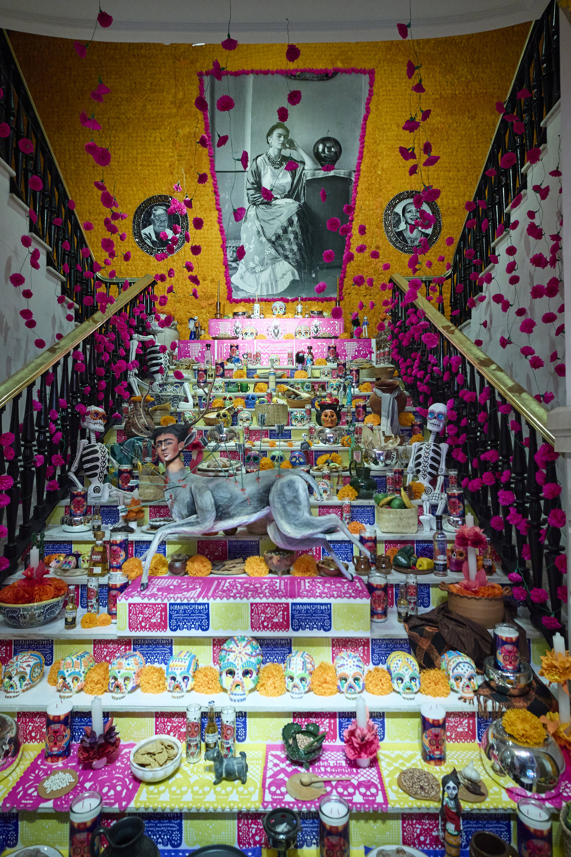 En declaraciones a Europa Press Televisión, el director de Fundación de Casa de México en España, Rubén Pizá, ha explicado que en el altar vemos "la artesanía mexicana enmarcando la obra de Frida 'El venado herido' y más de veinte mil flores hechas de papel". En el altar "se visualizan los elementos básicos, como comida y bebida, que más les gustaban a nuestros seres queridos en vida", y también los elementos: tierra, aire, fuego y agua.