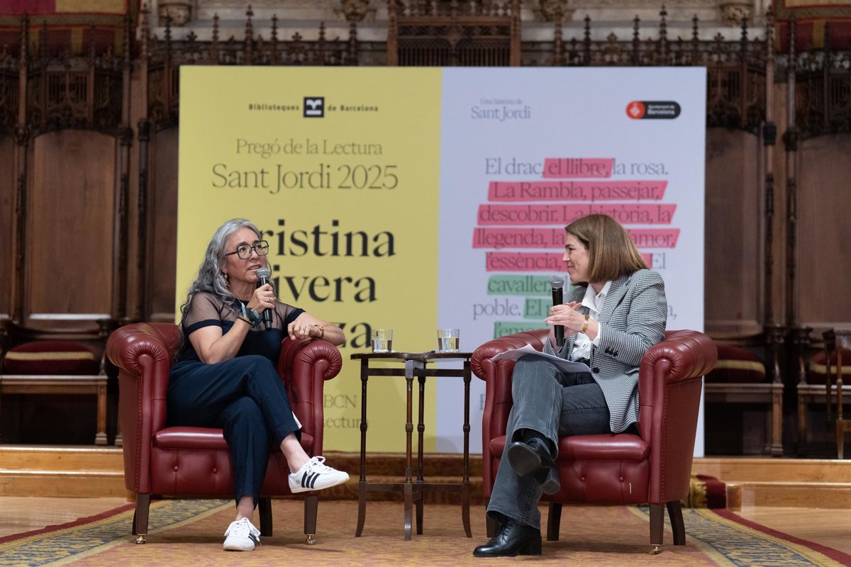 Archivo - La escritora mexicana Cristina Rivera (i), conversa con la periodista Anna Guitart (d), durante el pregón de la Lectura 2025, en el Ayuntamiento de Barcelona, a 22 de abril de 2025, en Barcelona, Catalunya (España). Rivera se suma a la lista de