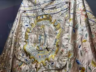 La exposición 'La seda china en Santillana del Mar' está compuesta por cinco escaparates. En tres se pueden apreciar prendas muy similares donde aparece bordada en seda la figura de Santa Juliana y que se sabe que vienen de Cantón (China) a través de Manila, México y otros lugares.
