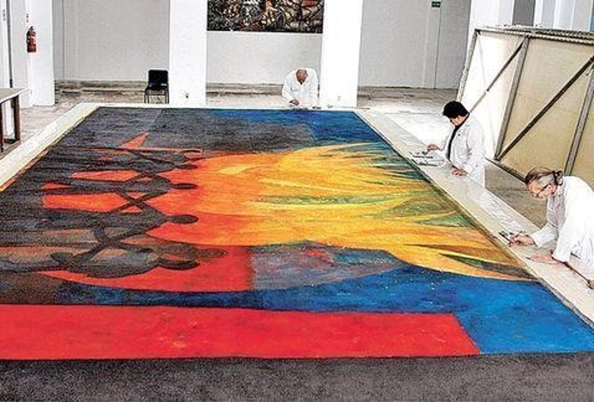 Esta imponente obra de Tamayo (Oaxaca, 1989 - Ciudad de México, 1991) fue realizada en 1968 sobre una tela de cáñamo, tejida por los artesanos de Texcoco, en la capital mexicano, por encargo del propio artista.